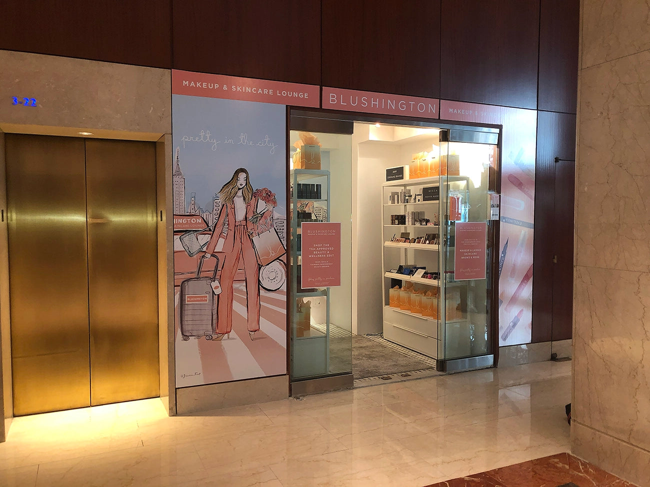 Illustrator Deanna First joined forces with makeup and beauty salon Blushington to create fashion illustrations used as window and wallpaper decals inside their NYC Pop-Up, The Parker Hotel - just steps away from Central Park, New York City. This fashion illustration scene was created with markers, colored pencils and digital editing. The window artwork caught prospective clients attention and drew them into the store for a full beauty experience, immersed in a world of Deanna First's artwork. Busy NYC cabs in Blushington's signature shade of pink, a New York City Skyline and a jet-setting woman on the go perfectly captures the bustling city of a glamorous woman in the city street.