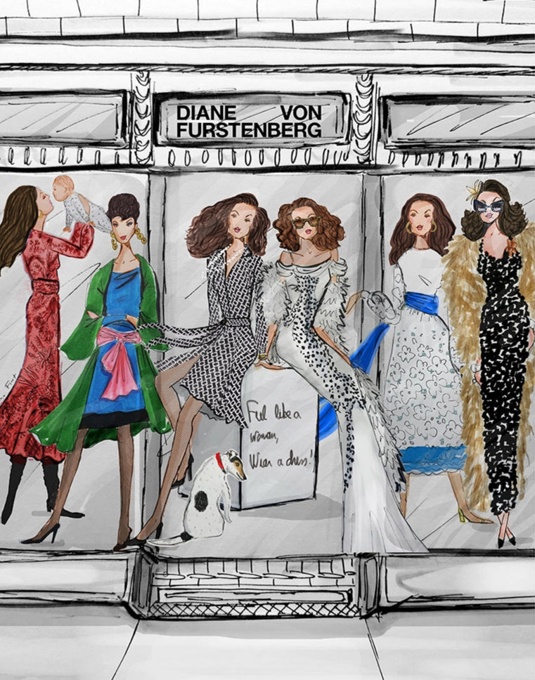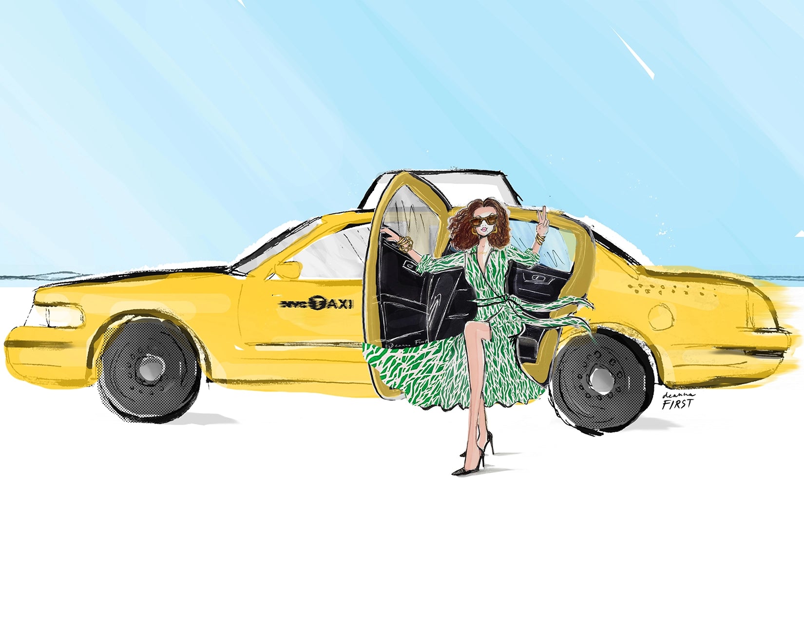 Illustrator Deanna First was commissioned by Greenlight Creative to create a Diane von Furstenberg illustration depicting Diane's fashion evolution and life throughout the years! The first illustration shows Diane emerging from an iconic NYC taxi cab wearing her signature iconic wrap dress that she is known for. These illustration was highly considered for her documentary 'Woman in Charge'.