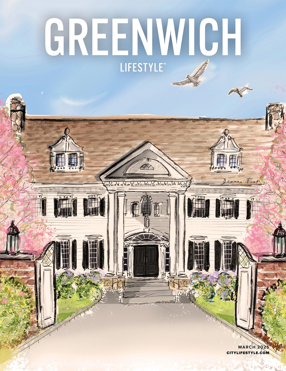 In March 2025, illustrator Deanna First was commissioned by Greenwich Lifestyle Magazine for their monthly culture and lifestyle publication. The cover depicted one of the many stately homes in Greenwich, Connecticut, rendered in her signature style, capturing the town’s historic charm. The use of birds flying in the blue skies, cherry blossoms in full bloom and the welcoming open gates - captures the energy of CT.