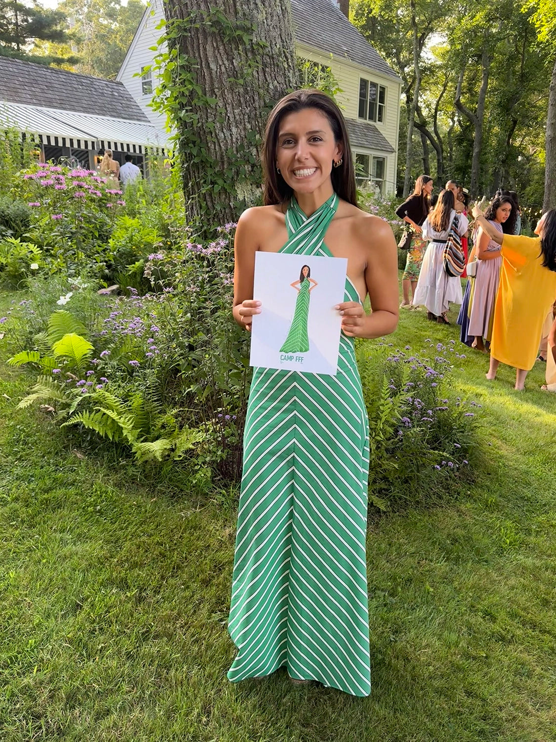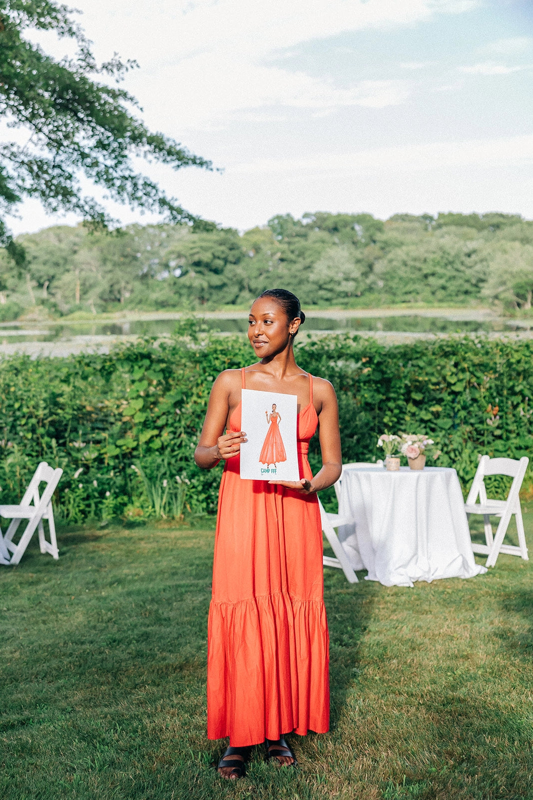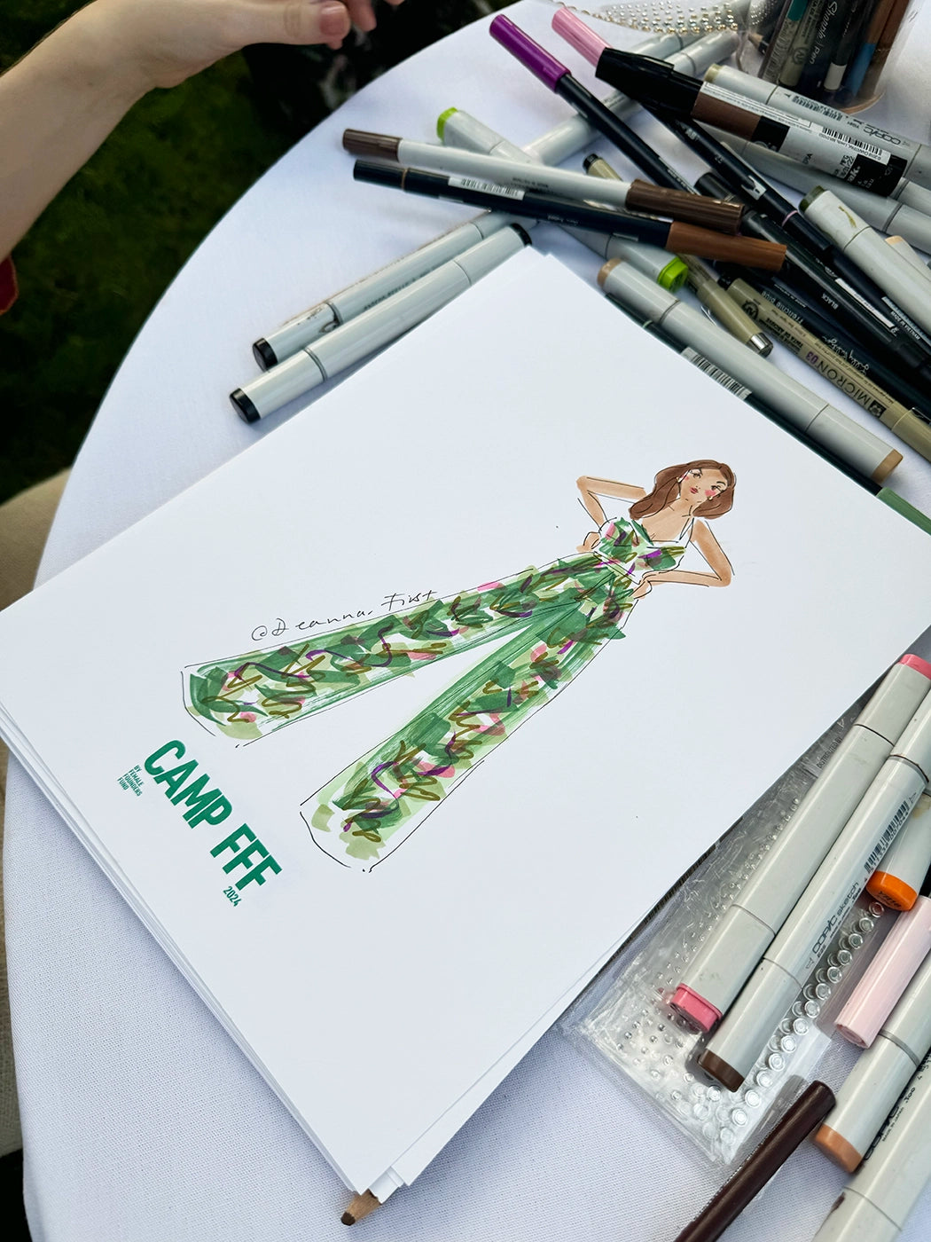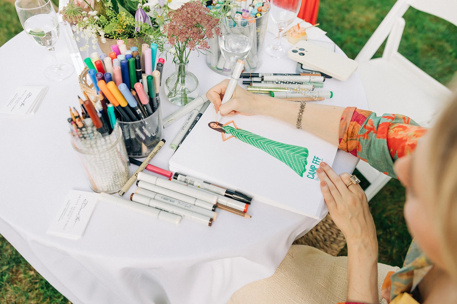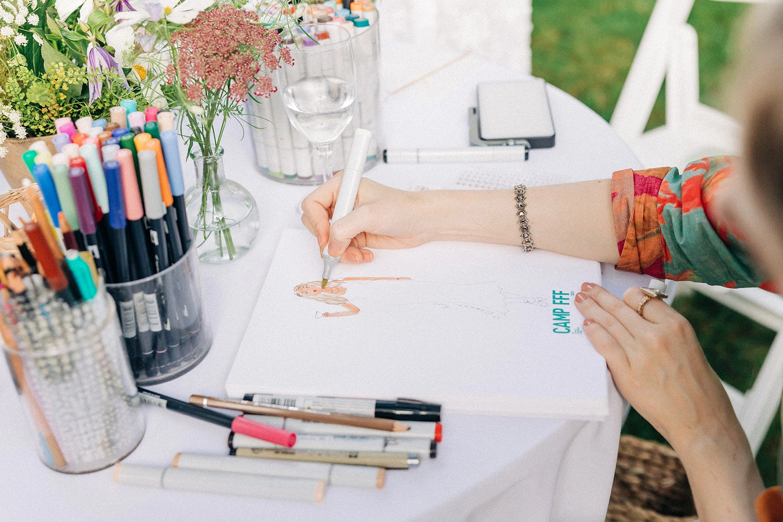 Illustrator Deanna First was commissioned by the Female Founders Fund (founded by Anu Duggal (to attend their 4th annual Camp FFF, a curated, invite‑only experience of determined female entrepreneurs and investors in The Hamptons. First captured guests in her signature feminine style created in minutes. First is known for illustrating the energy of a person just by glancing at them - while they strike a pose.