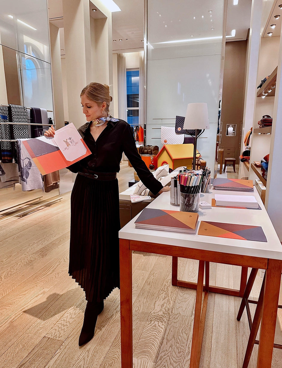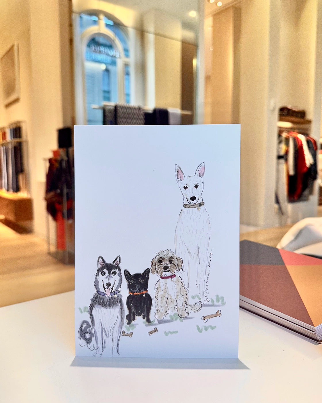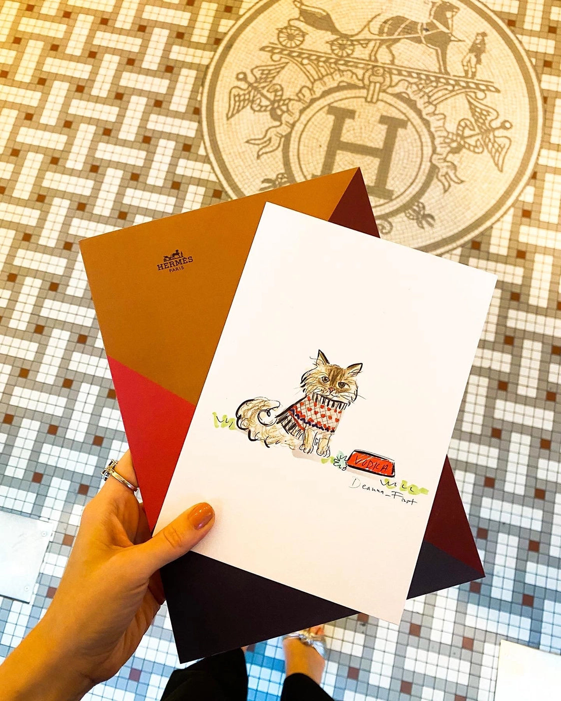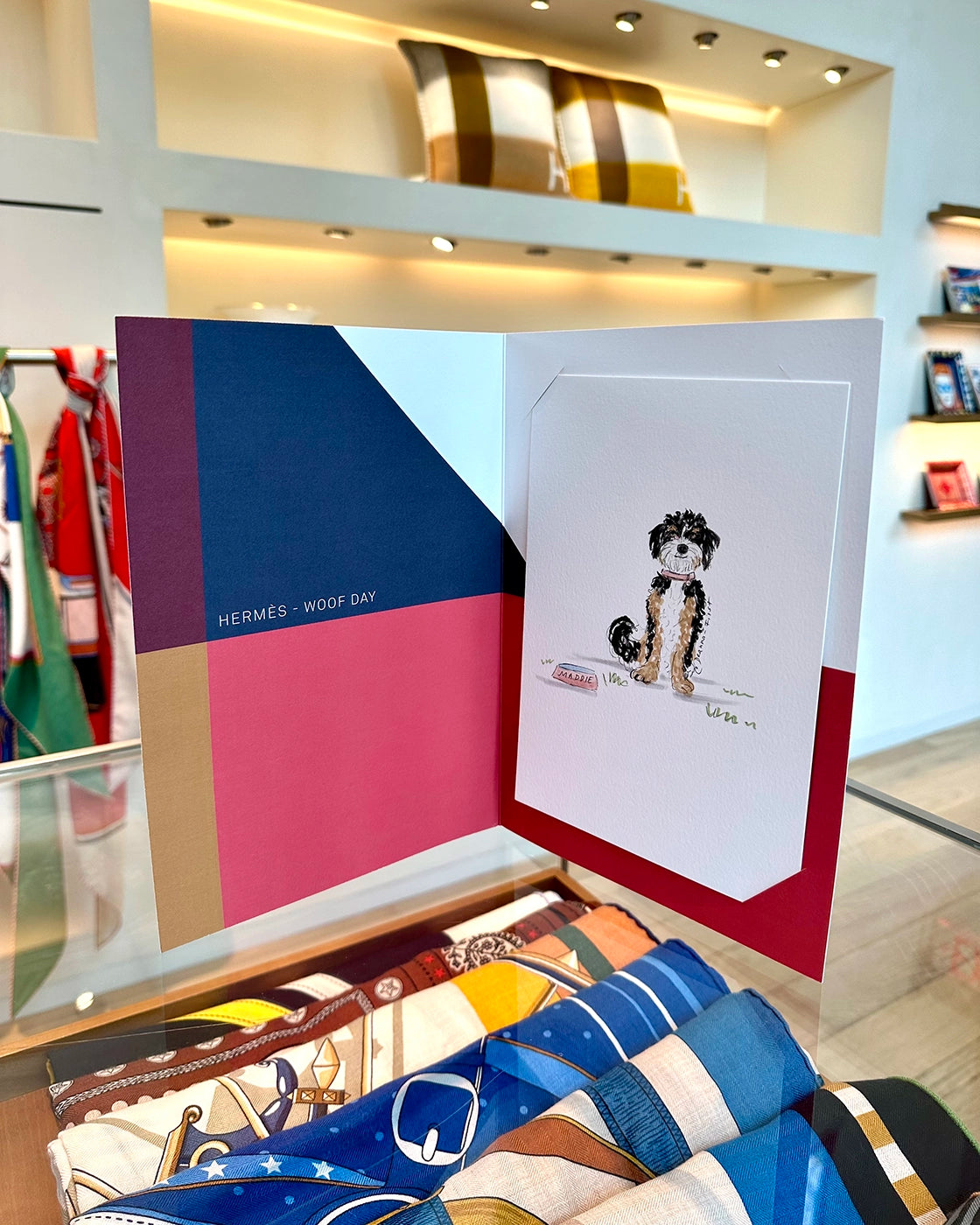 Illustrator Deanna First was honored to collaborate with Hermès for their exclusive Woof Day event, a luxury celebration of our furry friends - dogs. Held at select Hermès boutiques, the event featured live pet portrait illustrations by Deanna, known for her love of animals and signature style created with markers, colored pencils and ink.