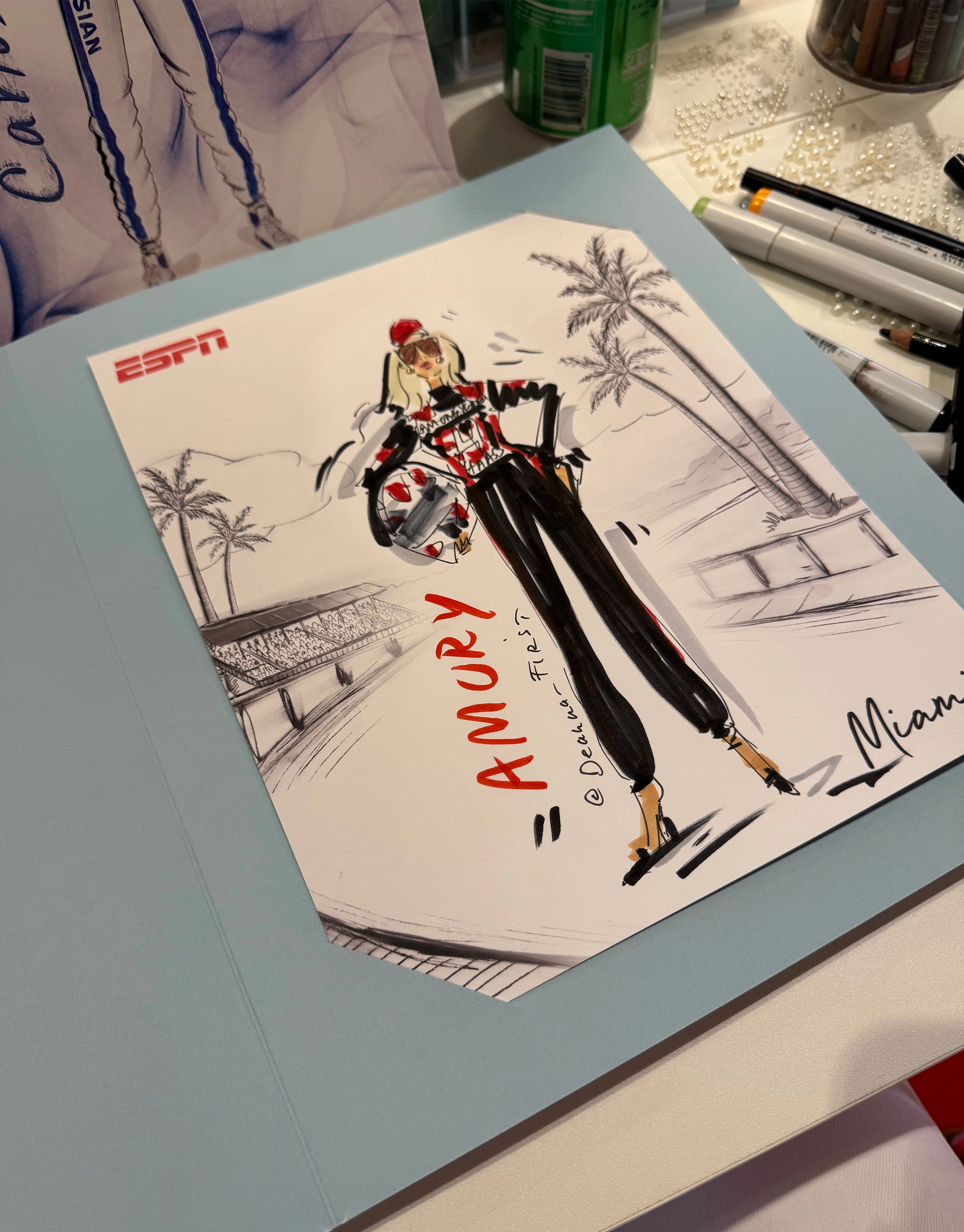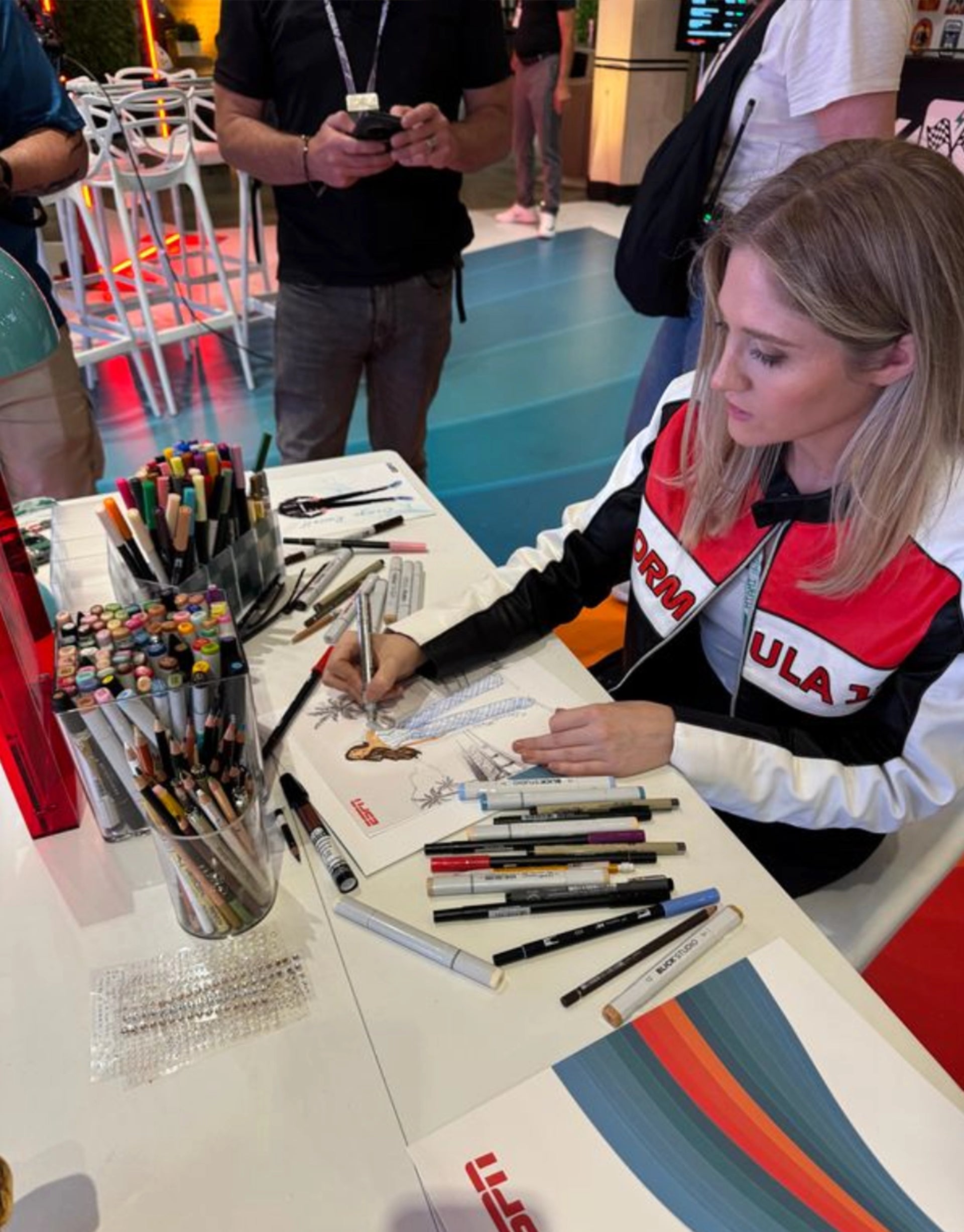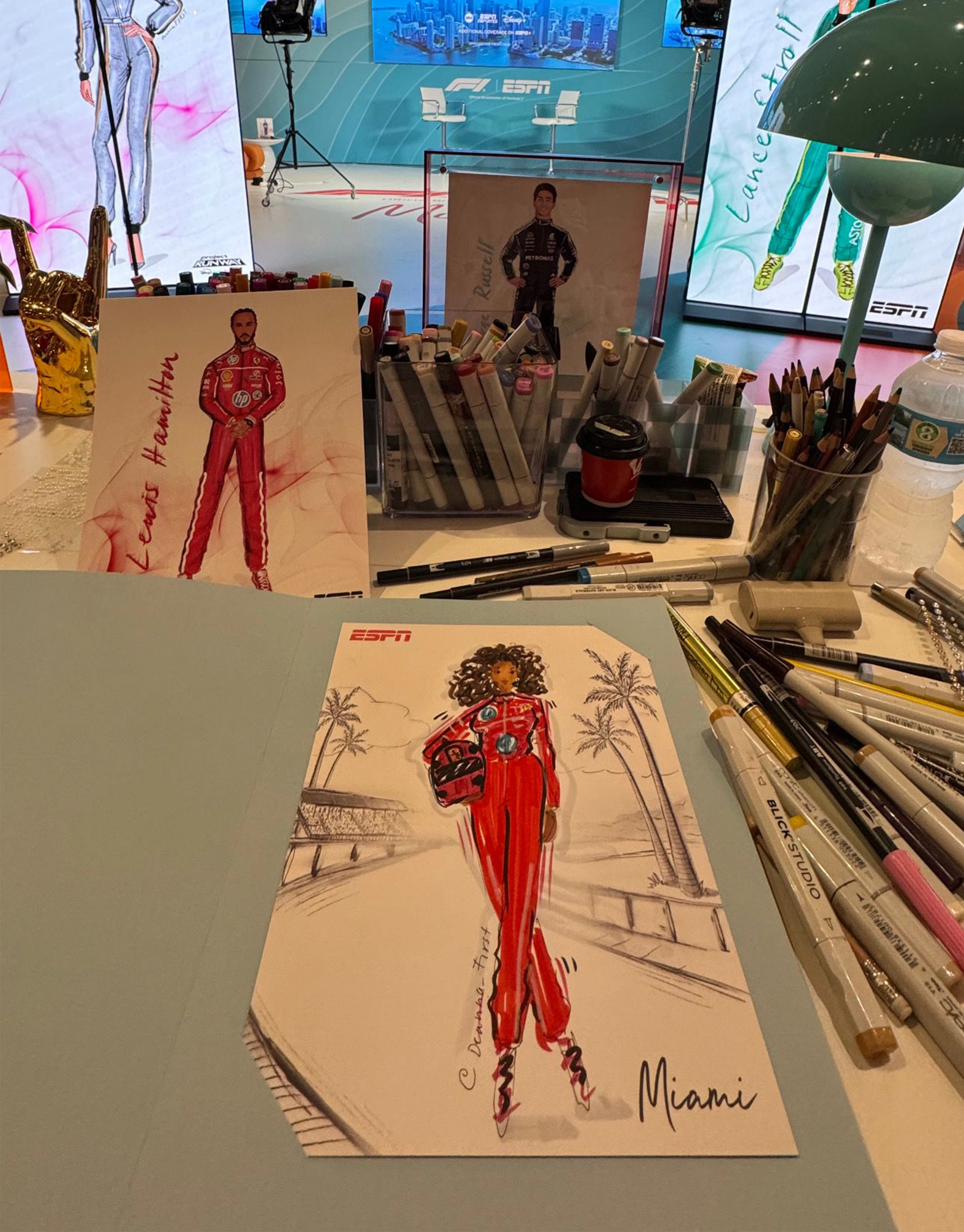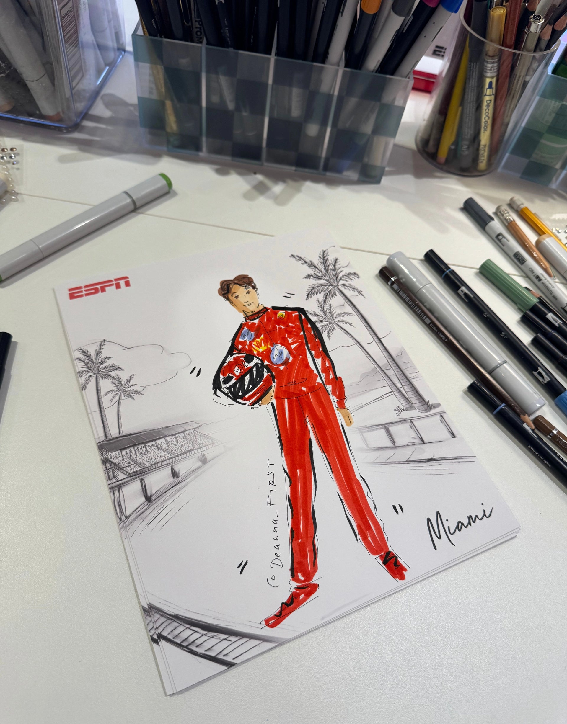 Illustrator Deanna First sketched the race drivers and VIP guests at Formula 1 Miami Paddock area. She was commissioned by Triton Productions for their ESPN Activation. Each guest was drawn in their favorite teams racing suit such as Ferrari, Mercedes, Red Bull and McLaren to name a few. These custom illustations were created in 4 minutes or less and gave guests a truly special take home gift to keep this iconic memory alive for years to come. In addition to live sketching, First's artwork was blown up on LED screens and served as impactful decor throughout the exclusive Paddock area. Each F1 driver also took home a personalized illustration that First created prior to the event.