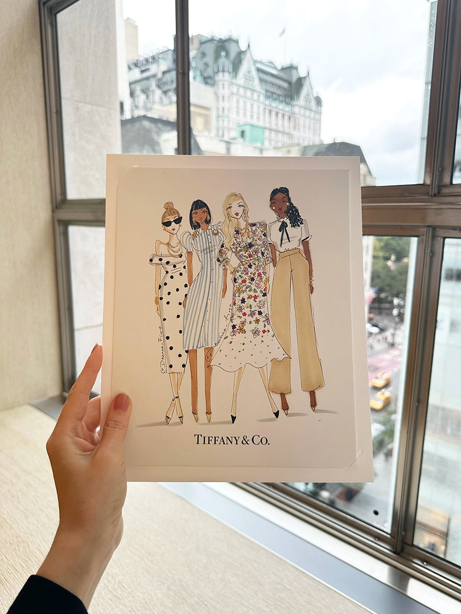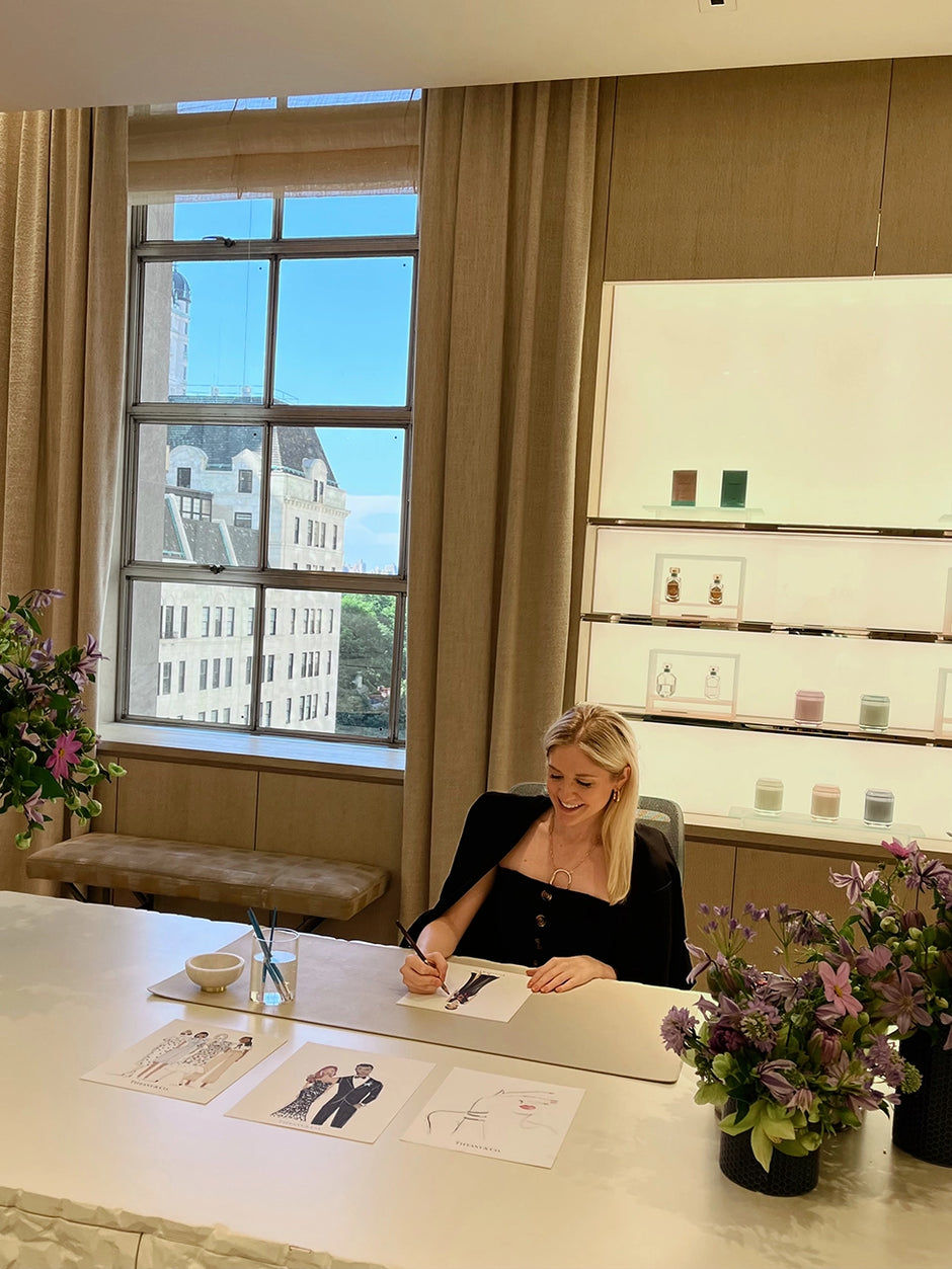 New York City illustrator Deanna First was proudly selected by luxury brand Tiffany & Co. to provide live sketching during the highly anticipated opening of their flagship store in NYC, The Landmark. Known for her signature diamonds, pearls and touch of silver and gold to all of her illustrations - this felt like the perfect collaboration to highlight Tiffany & Co., and their high end jewels.