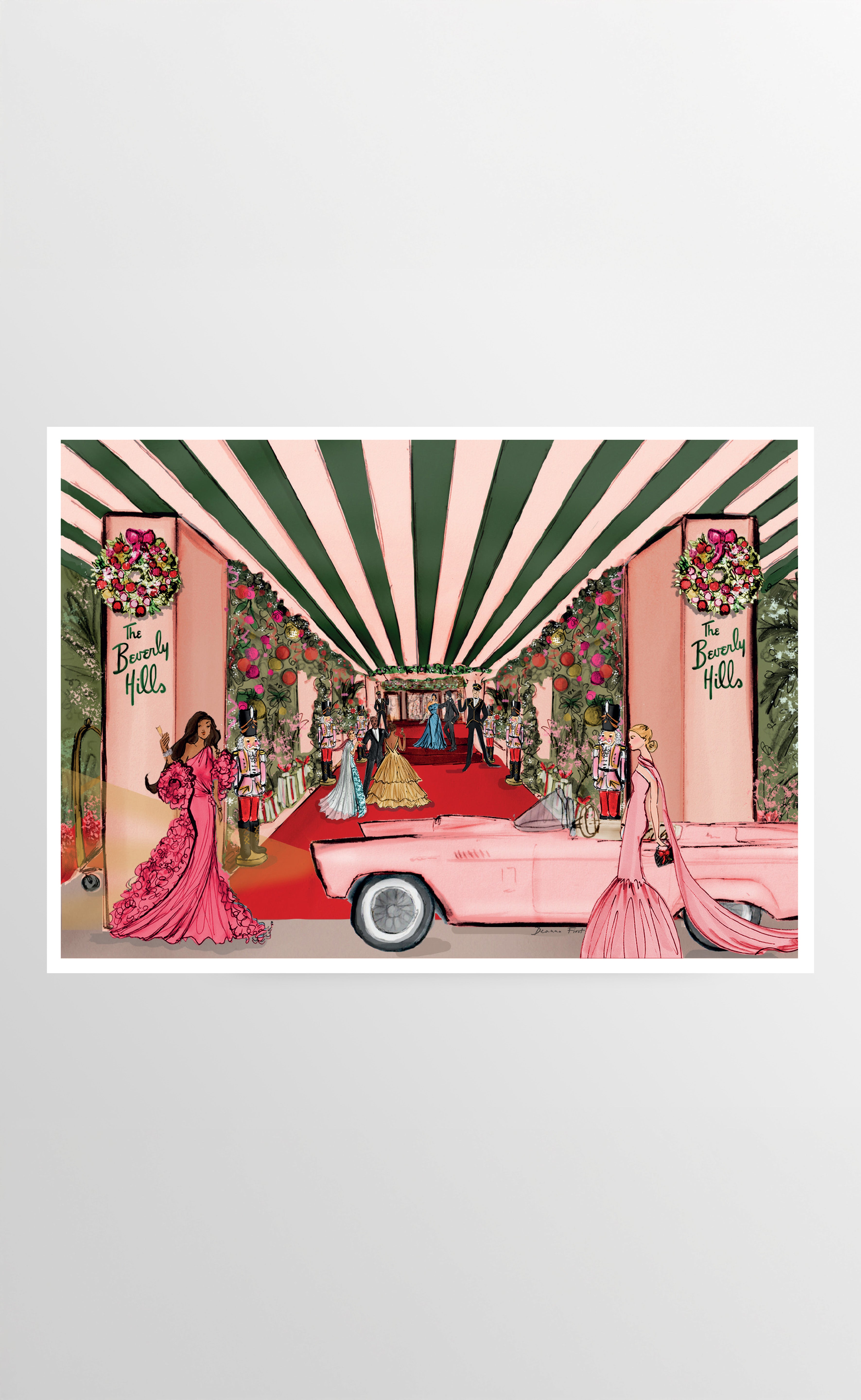 The Beverly Hills Hotel, Old Hollywood Print was originally commissioned by The Beverly Hills Hotel 2024 official holiday card. Their famous red carpet features Hollywood stars and guests enjoying an evening at the legendary 'Pink Palace'. This stunning print is the ideal gift for someone who appreciates glamour, fashion and Beverly Hills, California.